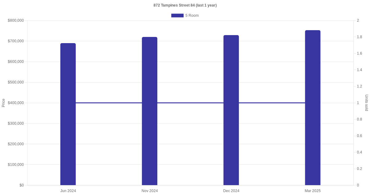| Mar 2025 | $752,888 | $6,222 | 5 Room | Blk 872 Tampines Street 84 5 Room / 121 sqm | 07 to 09 | 121 sqm | Improved | 1988 |