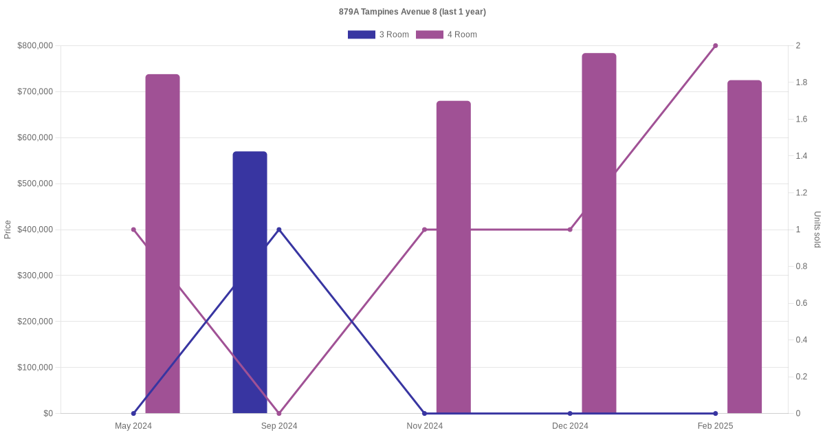Below is a quick summary of the resale transactions volume and average price trends for the 3 room and 4 room units at 879A Tampines Avenue 8.