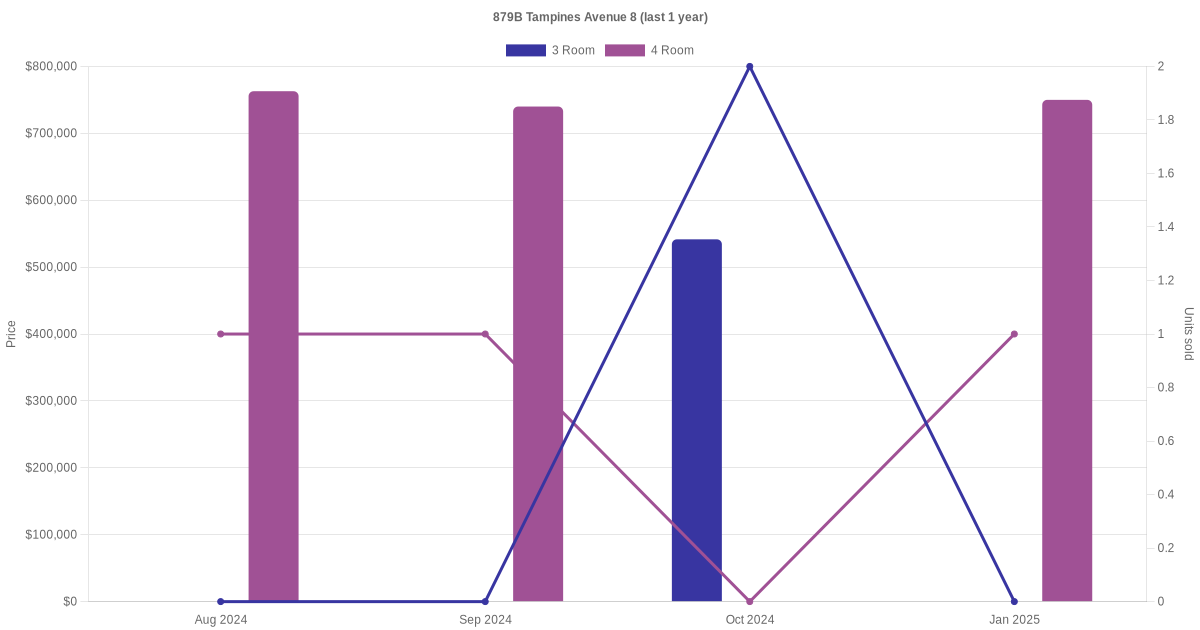 Below is a quick summary of the resale transactions volume and average price trends for the 3 room and 4 room units at 879B Tampines Avenue 8.
