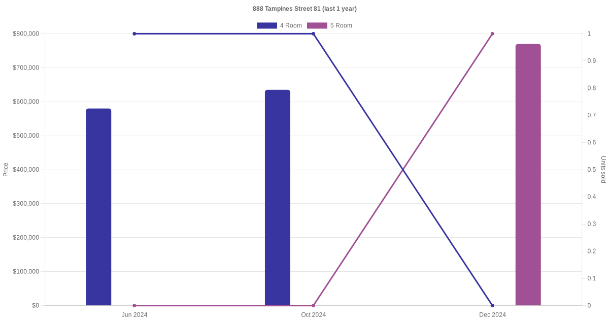 Below is a quick summary of the resale transactions volume and average price trends for the 4 room and 5 room units at 888 Tampines Street 81.