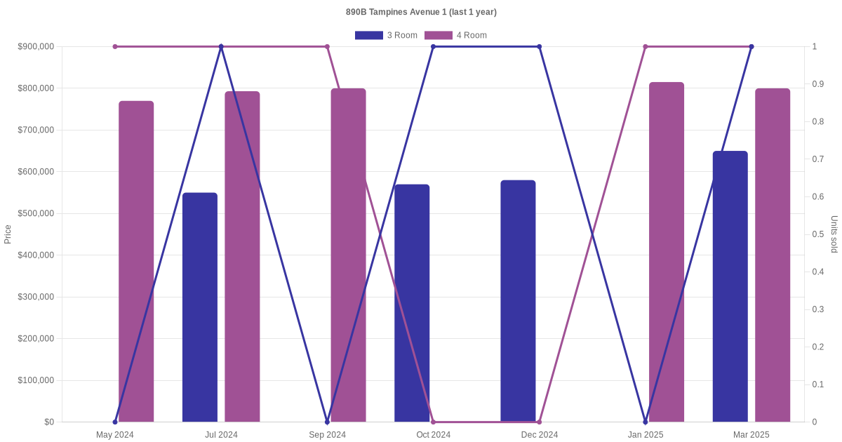 Below is a quick summary of the resale transactions volume and average price trends for the 3 room and 4 room units at 890B Tampines Avenue 1.