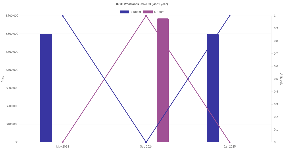 Below is a quick summary of the resale transactions volume and average price trends for the 4 room and 5 room units at 890B Woodlands Drive 50.