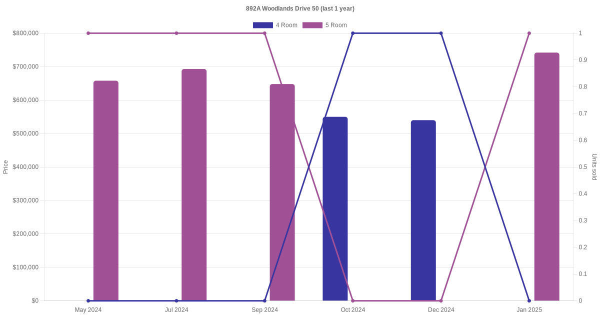 Below is a quick summary of the resale transactions volume and average price trends for the 4 room and 5 room units at 892A Woodlands Drive 50.