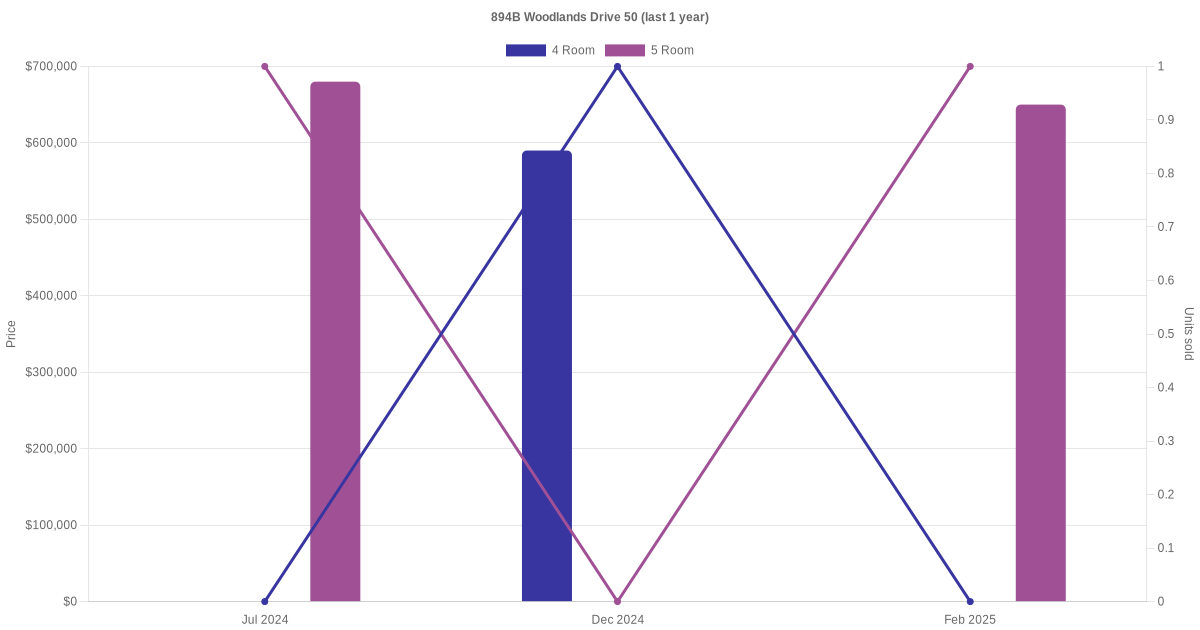 Below is a quick summary of the resale transactions volume and average price trends for the 4 room and 5 room units at 894B Woodlands Drive 50.