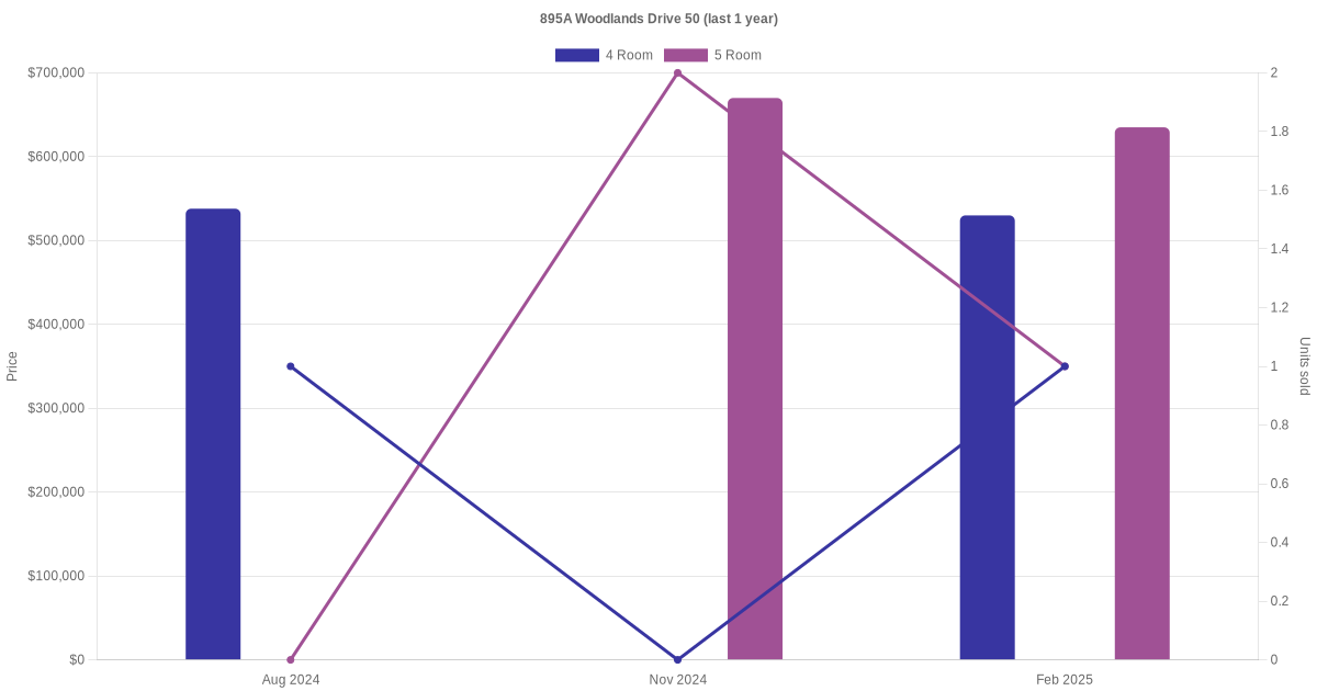Below is a quick summary of the resale transactions volume and average price trends for the 4 room and 5 room units at 895A Woodlands Drive 50.