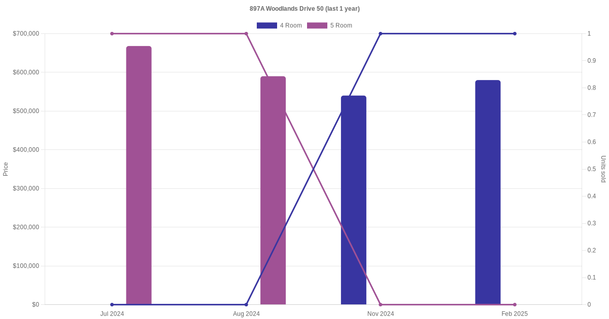Below is a quick summary of the resale transactions volume and average price trends for the 4 room and 5 room units at 897A Woodlands Drive 50.