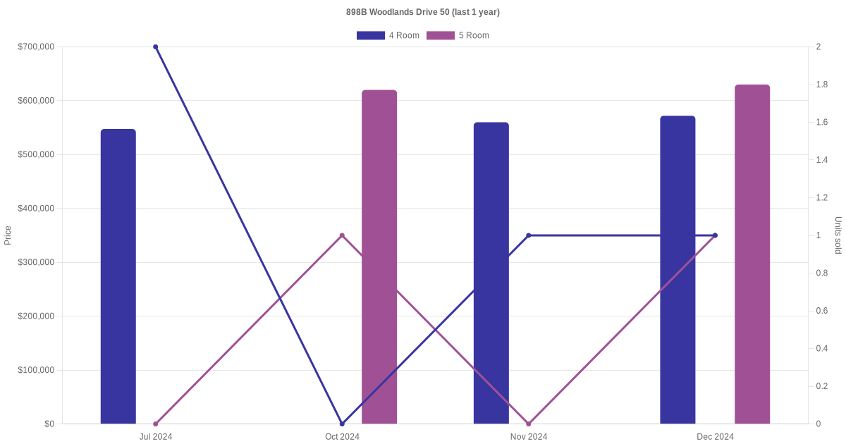 Below is a quick summary of the resale transactions volume and average price trends for the 4 room and 5 room units at 898B Woodlands Drive 50.