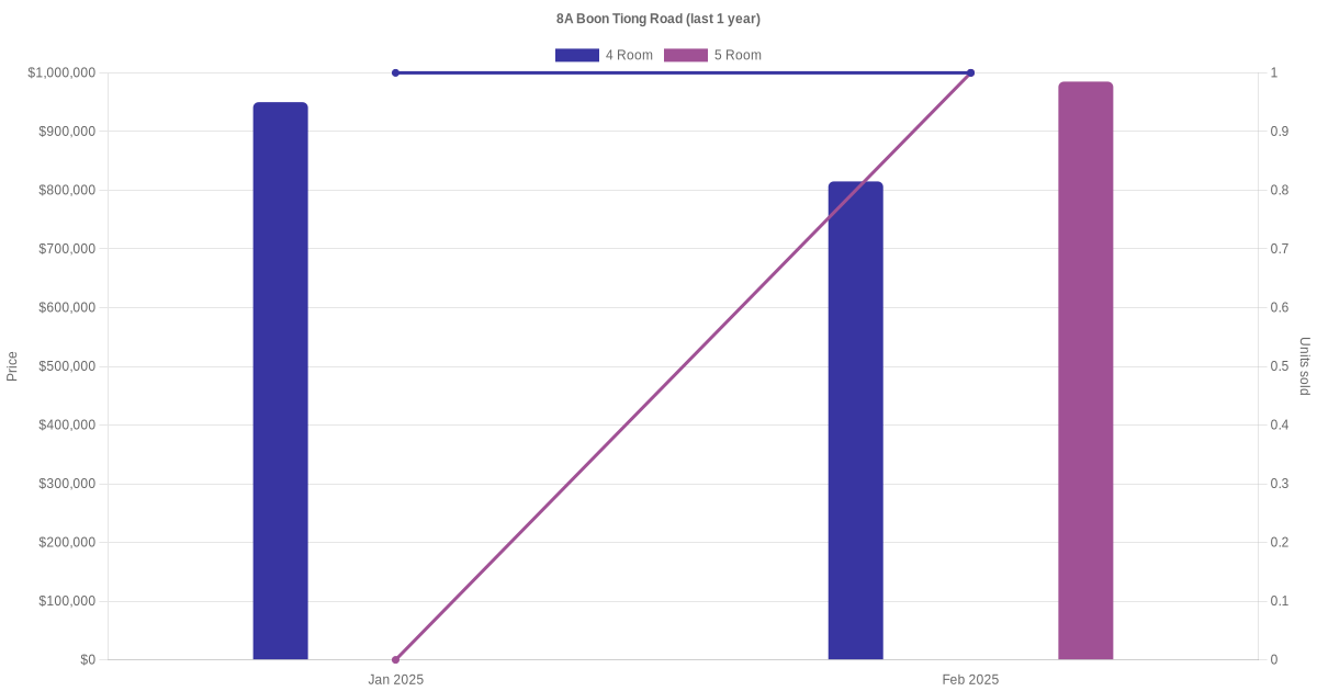 Below is a quick summary of the resale transactions volume and average price trends for the 4 room and 5 room units at 8A Boon Tiong Road.