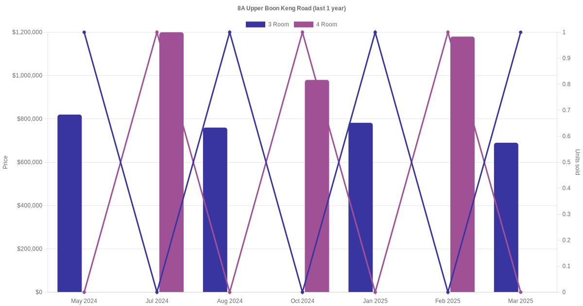 Below is a quick summary of the resale transactions volume and average price trends for the 3 room and 4 room units at 8A Upper Boon Keng Road.