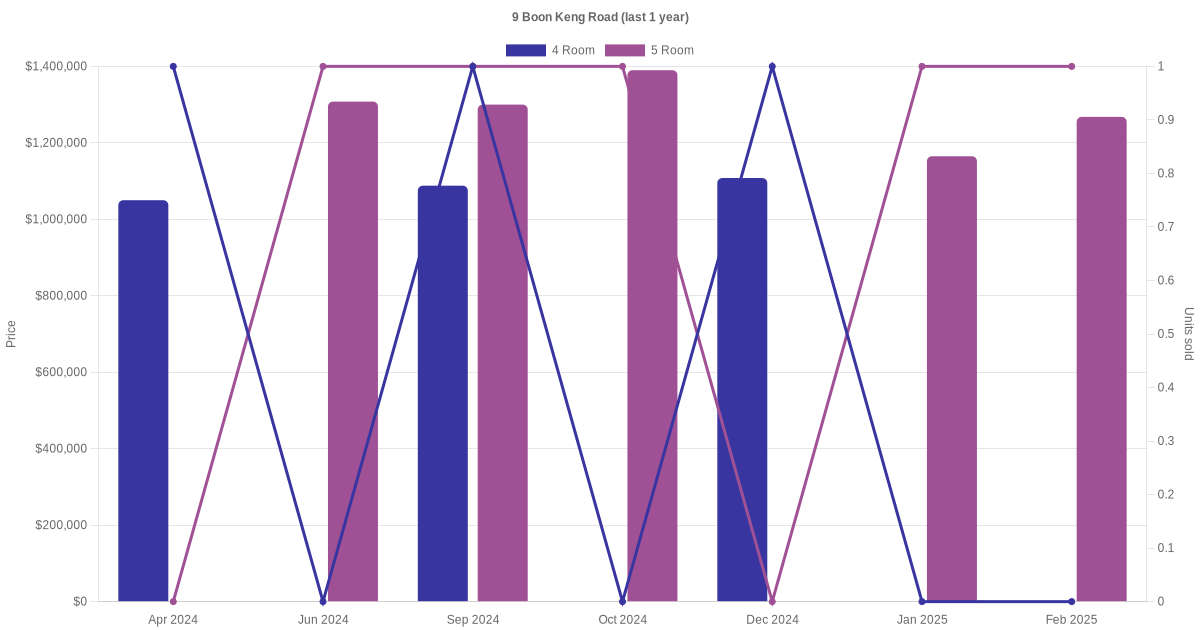 Below is a quick summary of the resale transactions volume and average price trends for the 4 room and 5 room units at 9 Boon Keng Road.