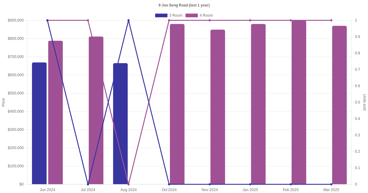 Below is a quick summary of the resale transactions volume and average price trends for the 3 room and 4 room units at 9 Joo Seng Road.