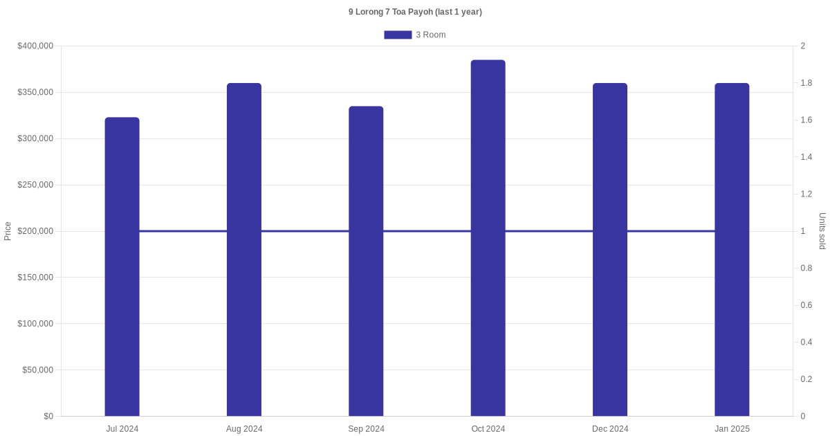 Below is a quick summary of the resale transactions volume and average price trends for the 3 room units at 9 Lorong 7 Toa Payoh.