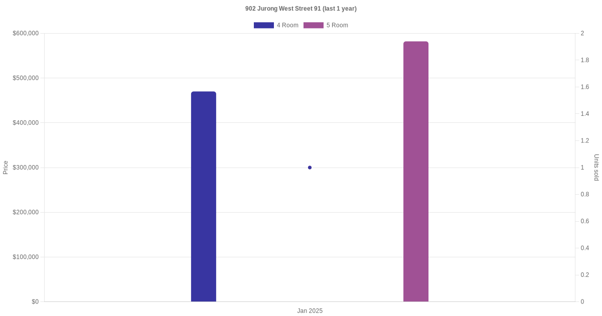 Below is a quick summary of the resale transactions volume and average price trends for the 4 room and 5 room units at 902 Jurong West Street 91.