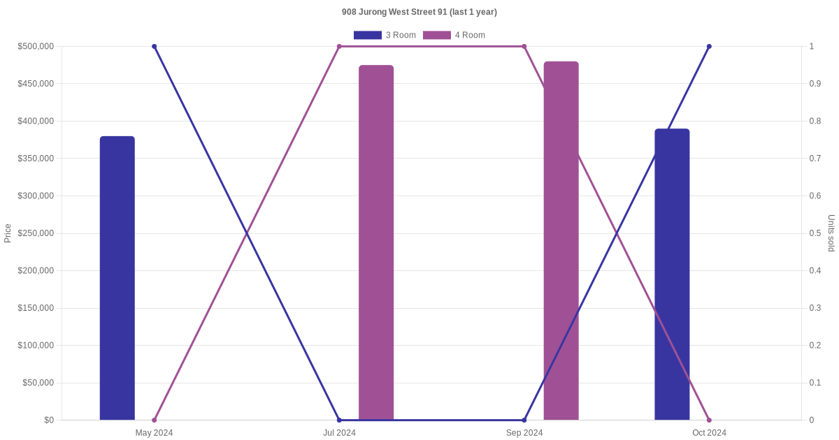 Below is a quick summary of the resale transactions volume and average price trends for the 3 room and 4 room units at 908 Jurong West Street 91.