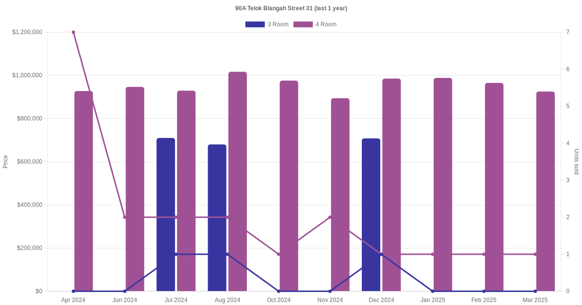 Below is a quick summary of the resale transactions volume and average price trends for the 3 room and 4 room units at 90A Telok Blangah Street 31.