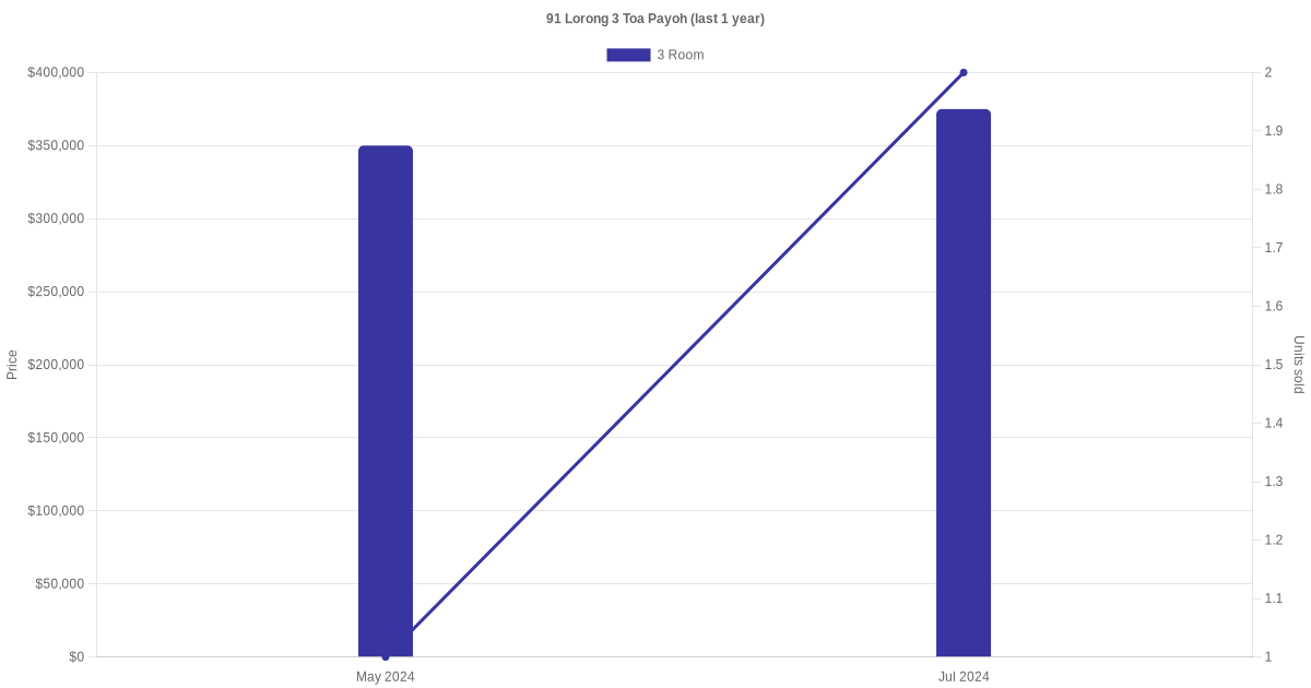 Below is a quick summary of the resale transactions volume and average price trends for the 3 room units at 91 Lorong 3 Toa Payoh.