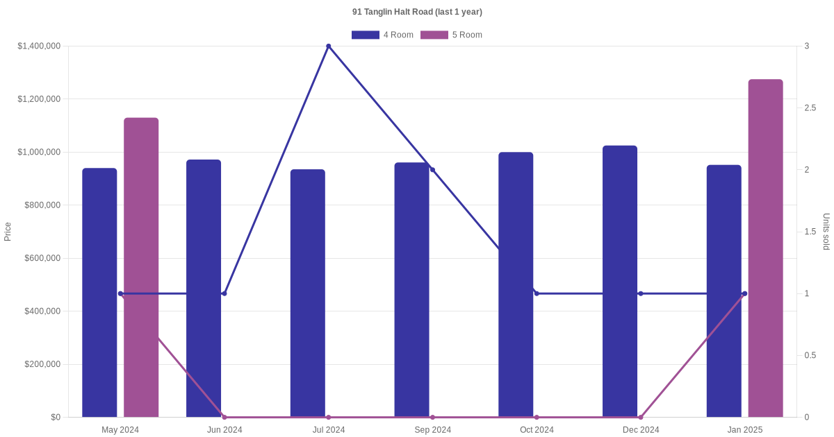 Below is a quick summary of the resale transactions volume and average price trends for the 4 room and 5 room units at 91 Tanglin Halt Road.