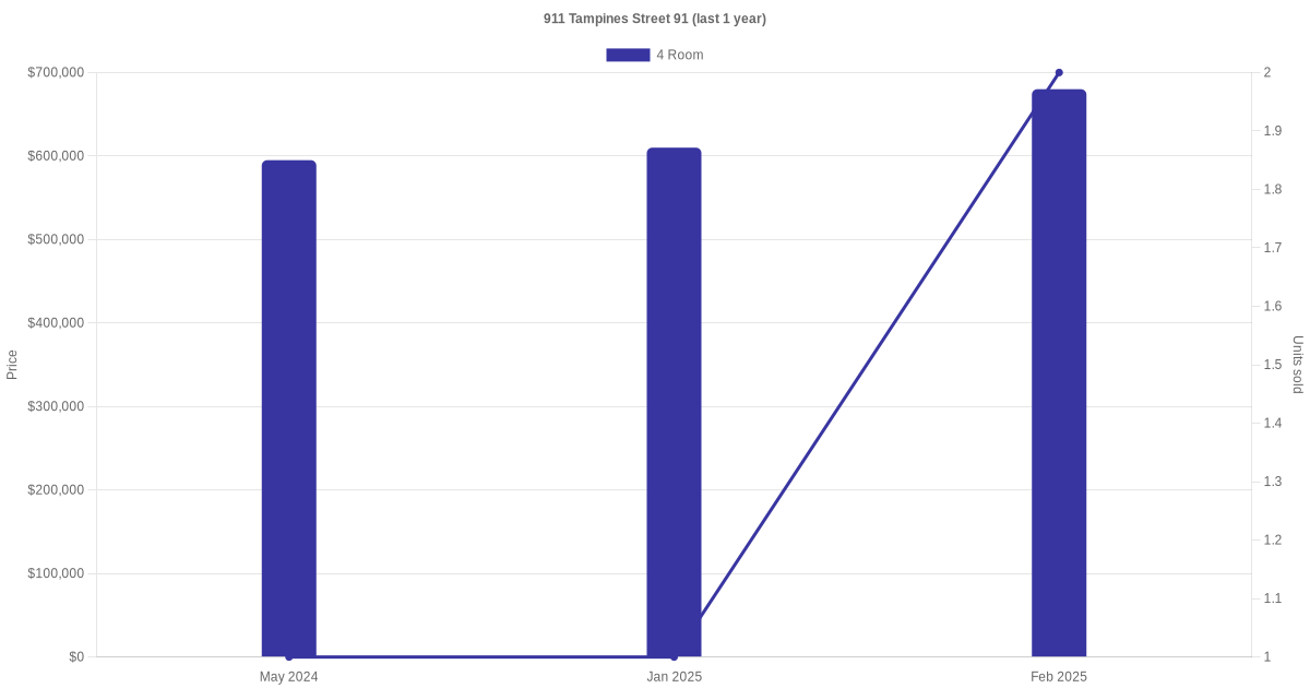 Below is a quick summary of the resale transactions volume and average price trends for the 4 room units at 911 Tampines Street 91.