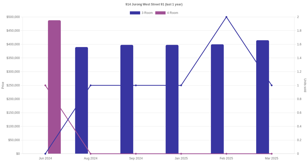 Below is a quick summary of the resale transactions volume and average price trends for the 3 room and 4 room units at 914 Jurong West Street 91.