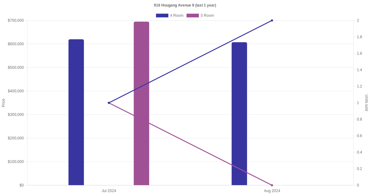Below is a quick summary of the resale transactions volume and average price trends for the 4 room and 5 room units at 916 Hougang Avenue 9.