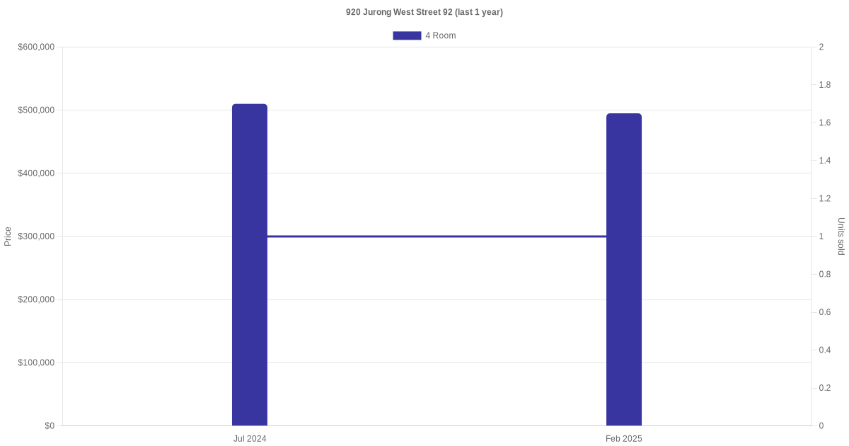 | Apr 2025 | $492,000 | $4,731 | 4 Room | Blk 920 Jurong West Street 92 4 Room / 104 sqm | 04 to 06 | 104 sqm | Model A | 1989 |