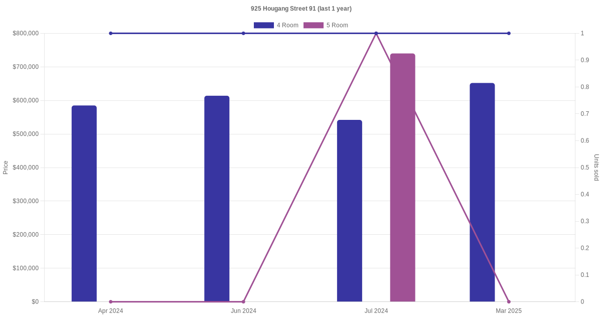 Below is a quick summary of the resale transactions volume and average price trends for the 4 room and 5 room units at 925 Hougang Street 91.