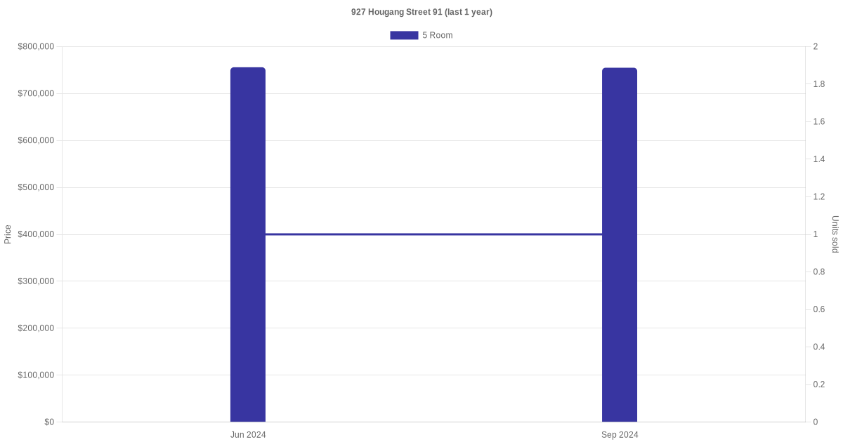 Below is a quick summary of the resale transactions volume and average price trends for the 4 room and 5 room units at 927 Hougang Street 91.
