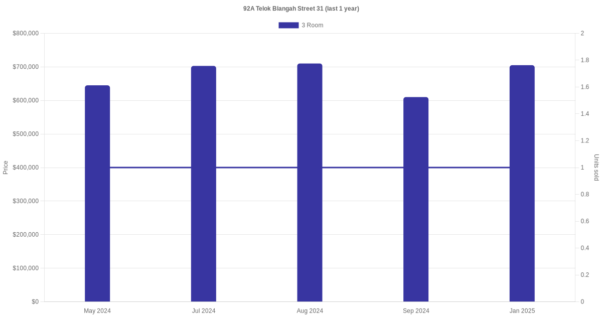 Below is a quick summary of the resale transactions volume and average price trends for the 3 room units at 92A Telok Blangah Street 31.