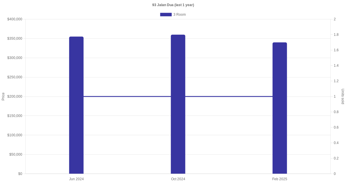 There were a total of 6 resale transactions in the last 3 years for units in block 93 Jalan Dua, with the latest one recorded in Dec 2025.