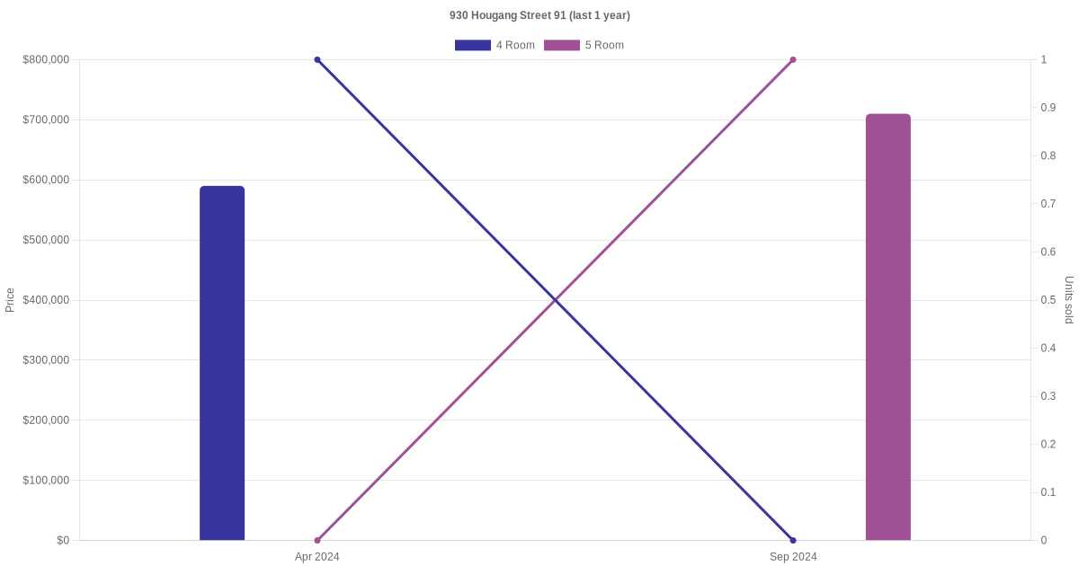 Below is a quick summary of the resale transactions volume and average price trends for the 4 room and 5 room units at 930 Hougang Street 91.