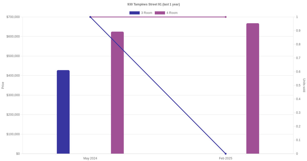 Below is a quick summary of the resale transactions volume and average price trends for the 3 room and 4 room units at 930 Tampines Street 91.