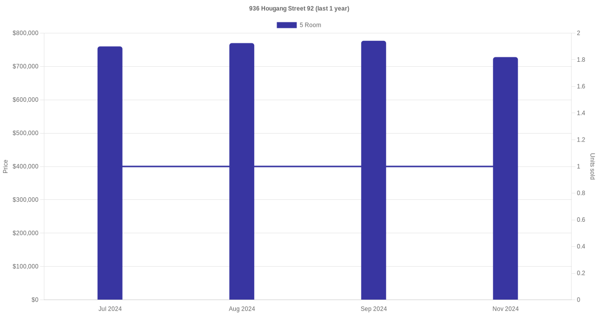 Below is a quick summary of the resale transactions volume and average price trends for the 4 room and 5 room units at 936 Hougang Street 92.