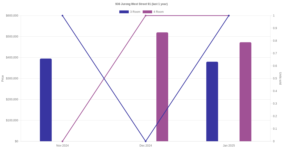 Below is a quick summary of the resale transactions volume and average price trends for the 3 room and 4 room units at 936 Jurong West Street 91.