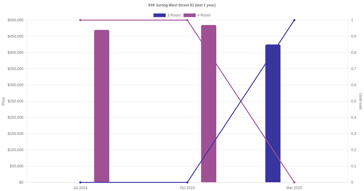 Below is a quick summary of the resale transactions volume and average price trends for the 3 room and 4 room units at 939 Jurong West Street 91.
