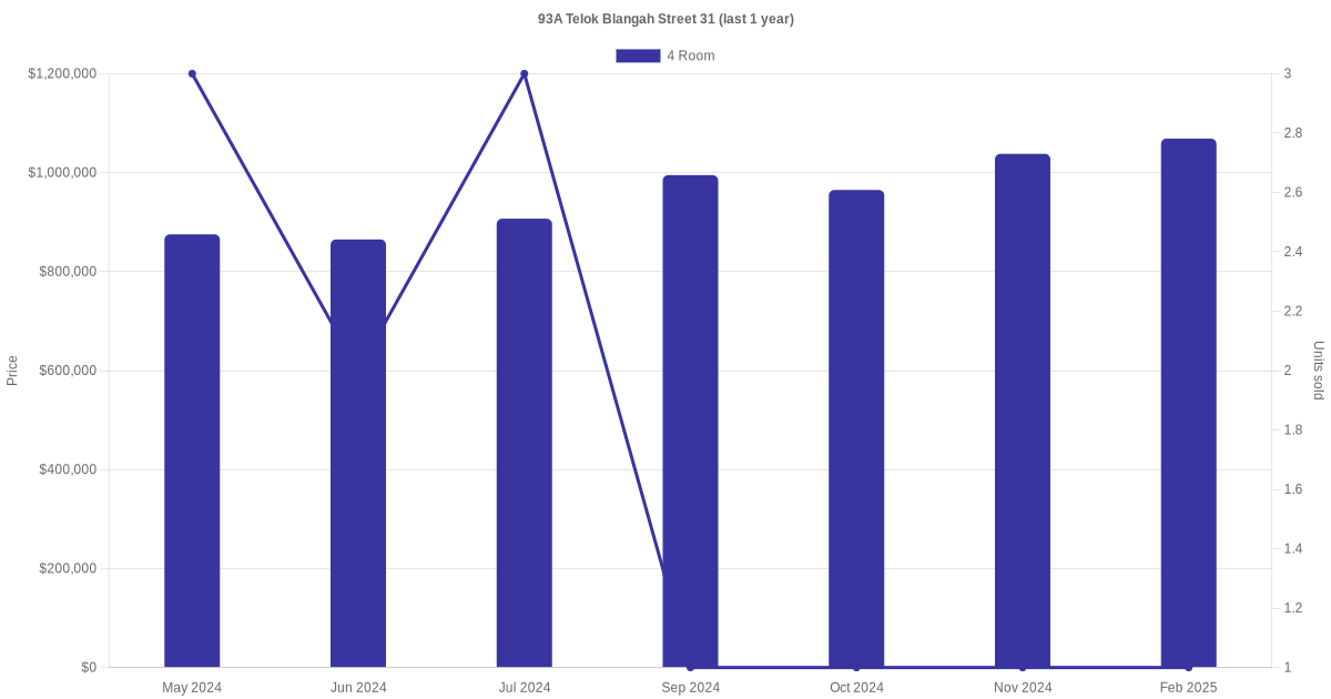 Below is a quick summary of the resale transactions volume and average price trends for the 3 room and 4 room units at 93A Telok Blangah Street 31.