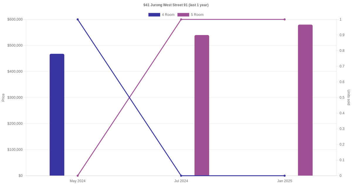 Below is a quick summary of the resale transactions volume and average price trends for the 4 room and 5 room units at 941 Jurong West Street 91.
