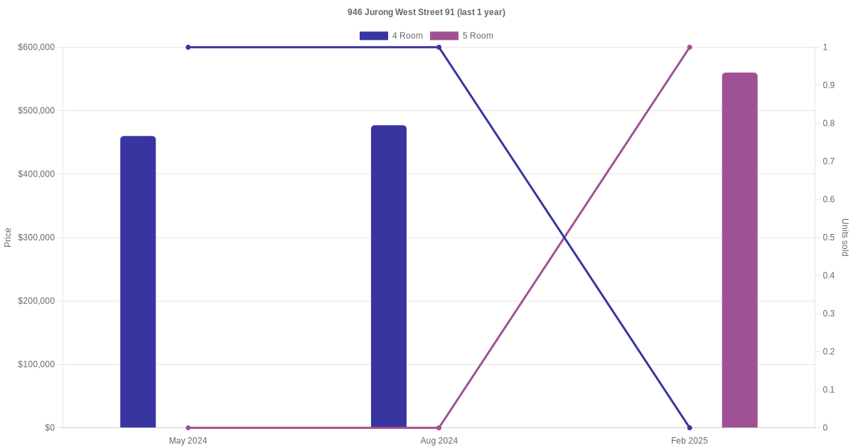 Below is a quick summary of the resale transactions volume and average price trends for the 4 room and 5 room units at 946 Jurong West Street 91.