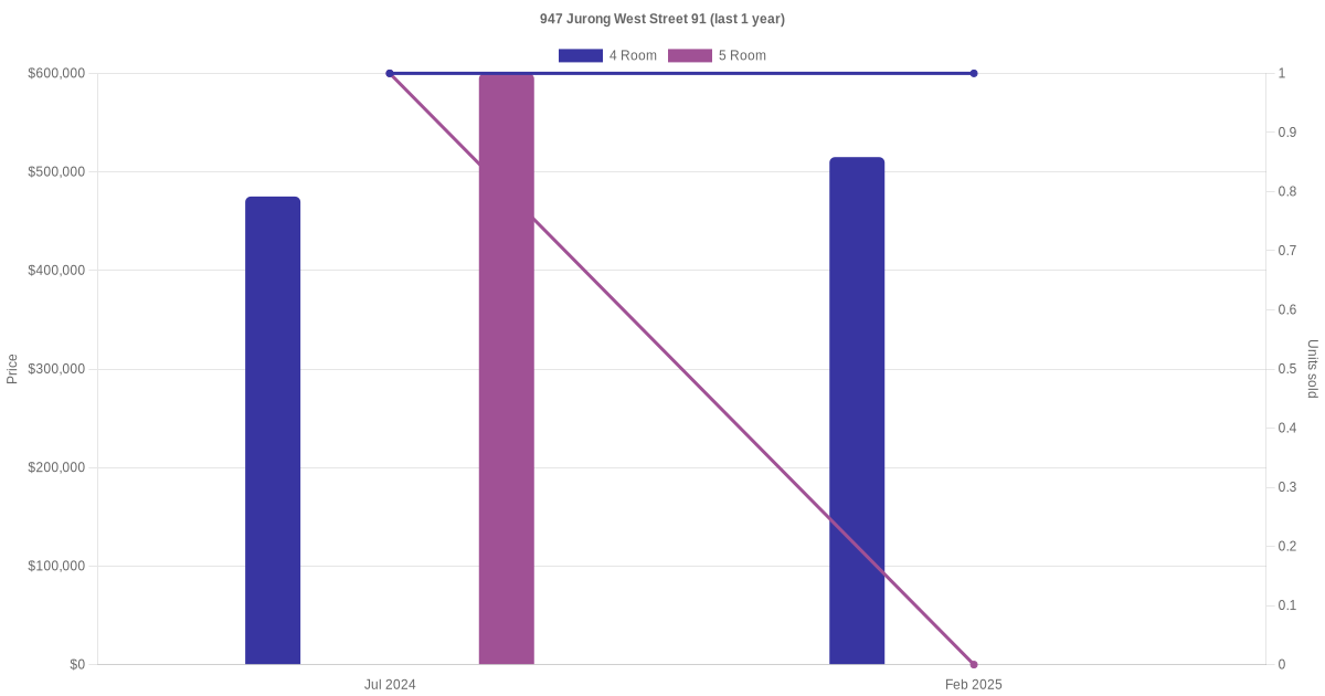 Below is a quick summary of the resale transactions volume and average price trends for the 4 room and 5 room units at 947 Jurong West Street 91.