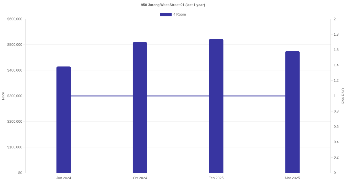 | Mar 2025 | $475,000 | $4,524 | 4 Room | Blk 950 Jurong West Street 91 4 Room / 105 sqm | 01 to 03 | 105 sqm | Model A | 1989 |