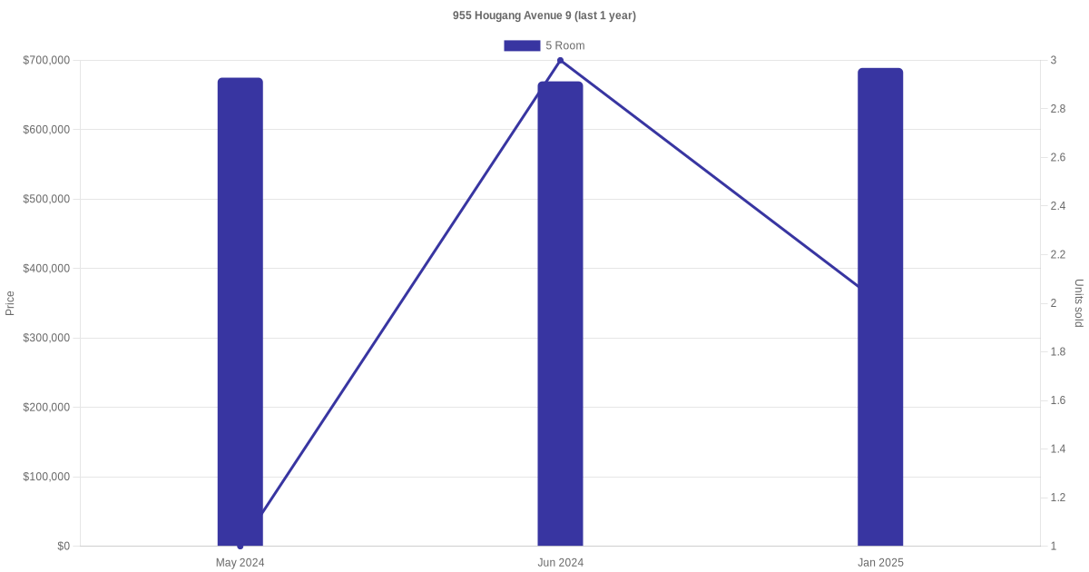 Below is a quick summary of the resale transactions volume and average price trends for the 5 room units at 955 Hougang Avenue 9.