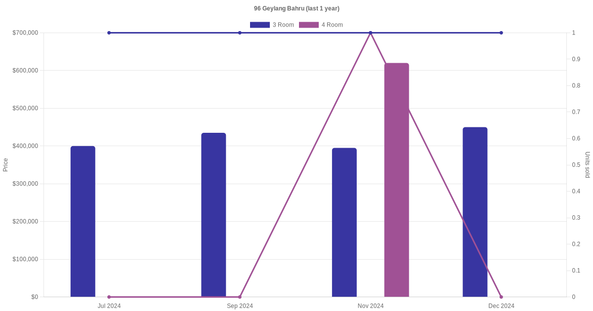 Here's a summary of the rental transactions and price trends for the 3 room and 4 room units at 96 Geylang Bahru.