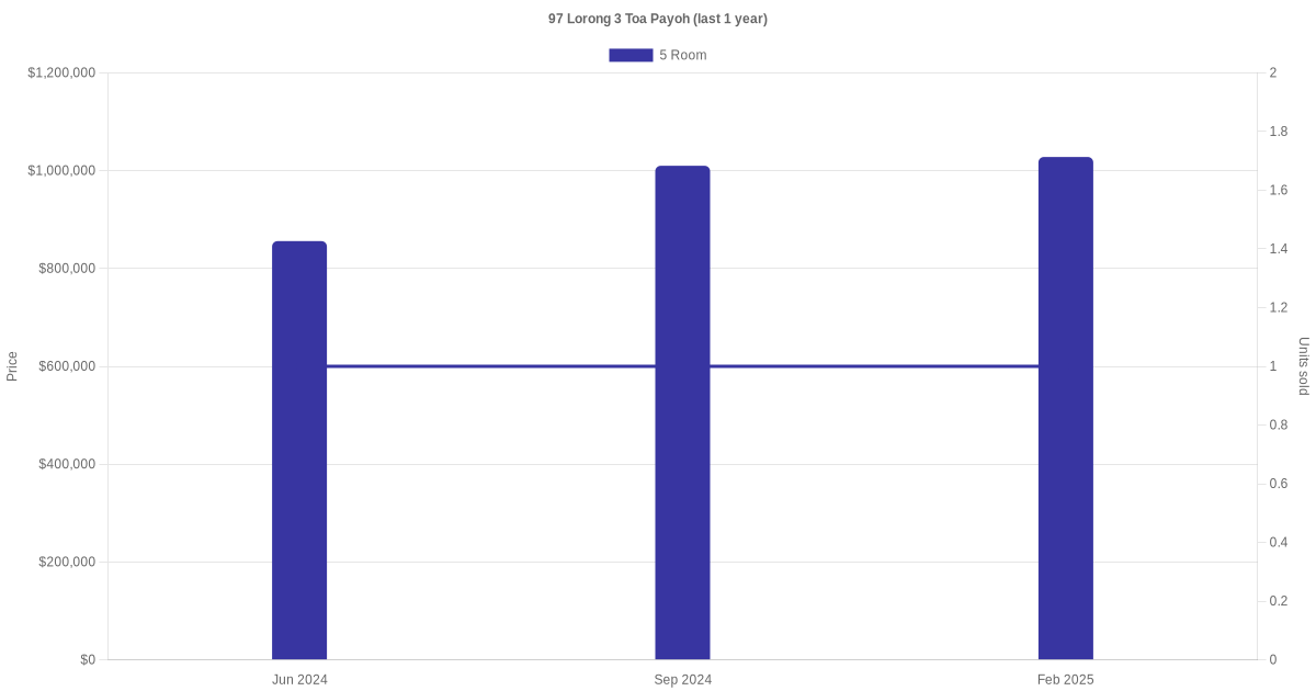 Below is a quick summary of the resale transactions volume and average price trends for the 5 room units at 97 Lorong 3 Toa Payoh.