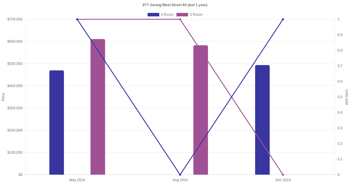 Below is a quick summary of the resale transactions volume and average price trends for the 4 room and 5 room units at 977 Jurong West Street 93.