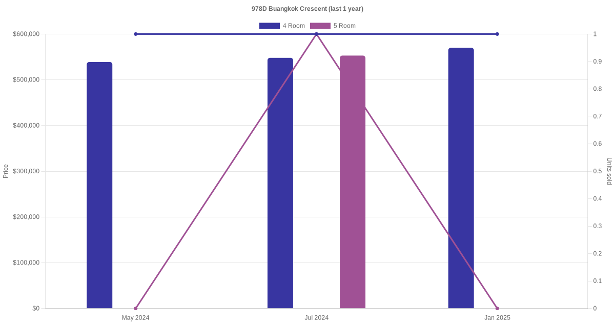 Below is a quick summary of the resale transactions volume and average price trends for the 4 room and 5 room units at 978D Buangkok Crescent.