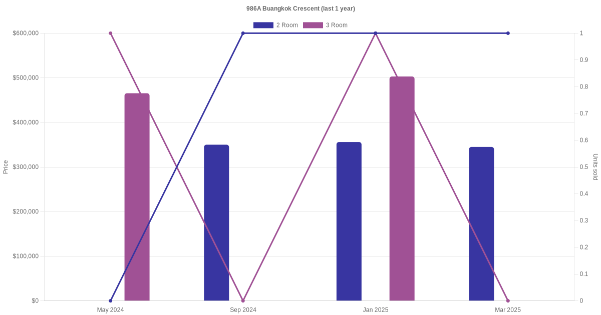 Below is a quick summary of the resale transactions volume and average price trends for the 2 room and 3 room units at 986A Buangkok Crescent.