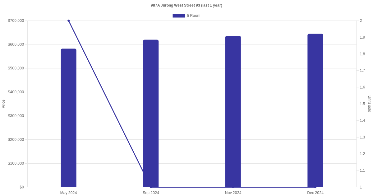 There were a total of 12 resale transactions in the last 3 years for units in block 987A Jurong West Street 93, with the latest one recorded in Dec 2024.