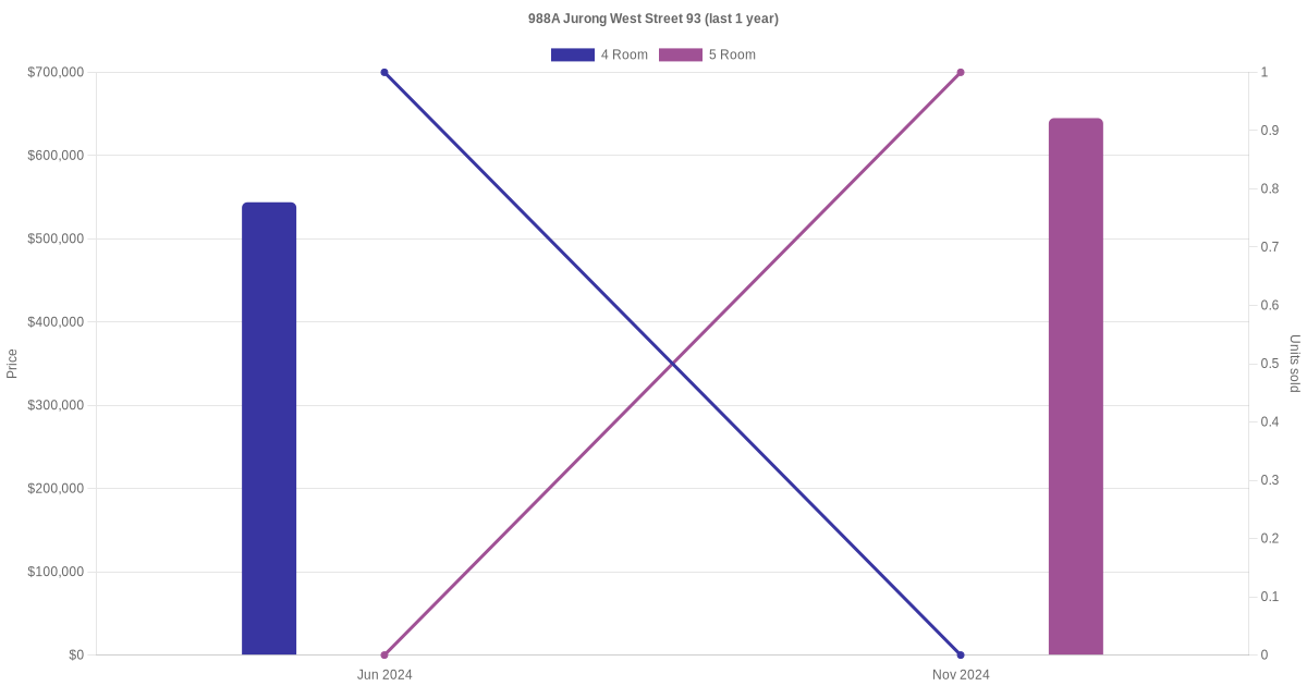 Below is a quick summary of the resale transactions volume and average price trends for the 4 room and 5 room units at 988A Jurong West Street 93.