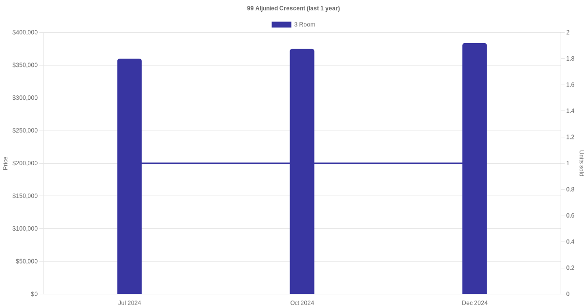 | Dec 2024 | $383,888 | $5,730 | 3 Room | Blk 99 Aljunied Crescent 3 Room / 67 sqm | 04 to 06 | 67 sqm | New Generation | 1978 |