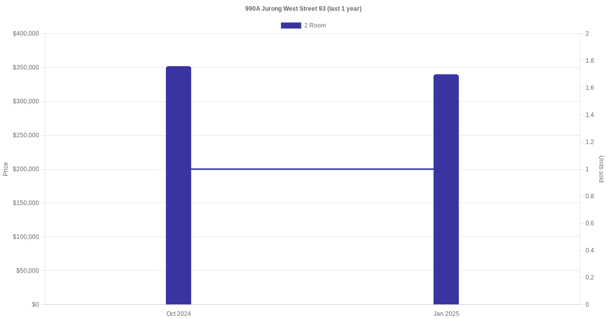 Below is a quick summary of the resale transactions volume and average price trends for the 2 room units at 990A Jurong West Street 93.