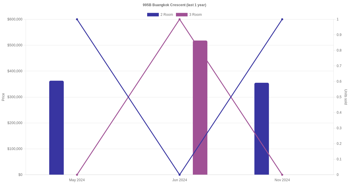 Below is a quick summary of the resale transactions volume and average price trends for the 2 room and 3 room units at 995B Buangkok Crescent.